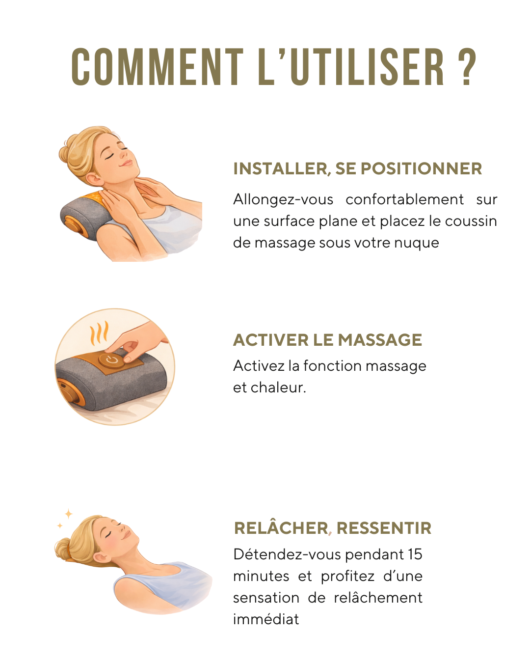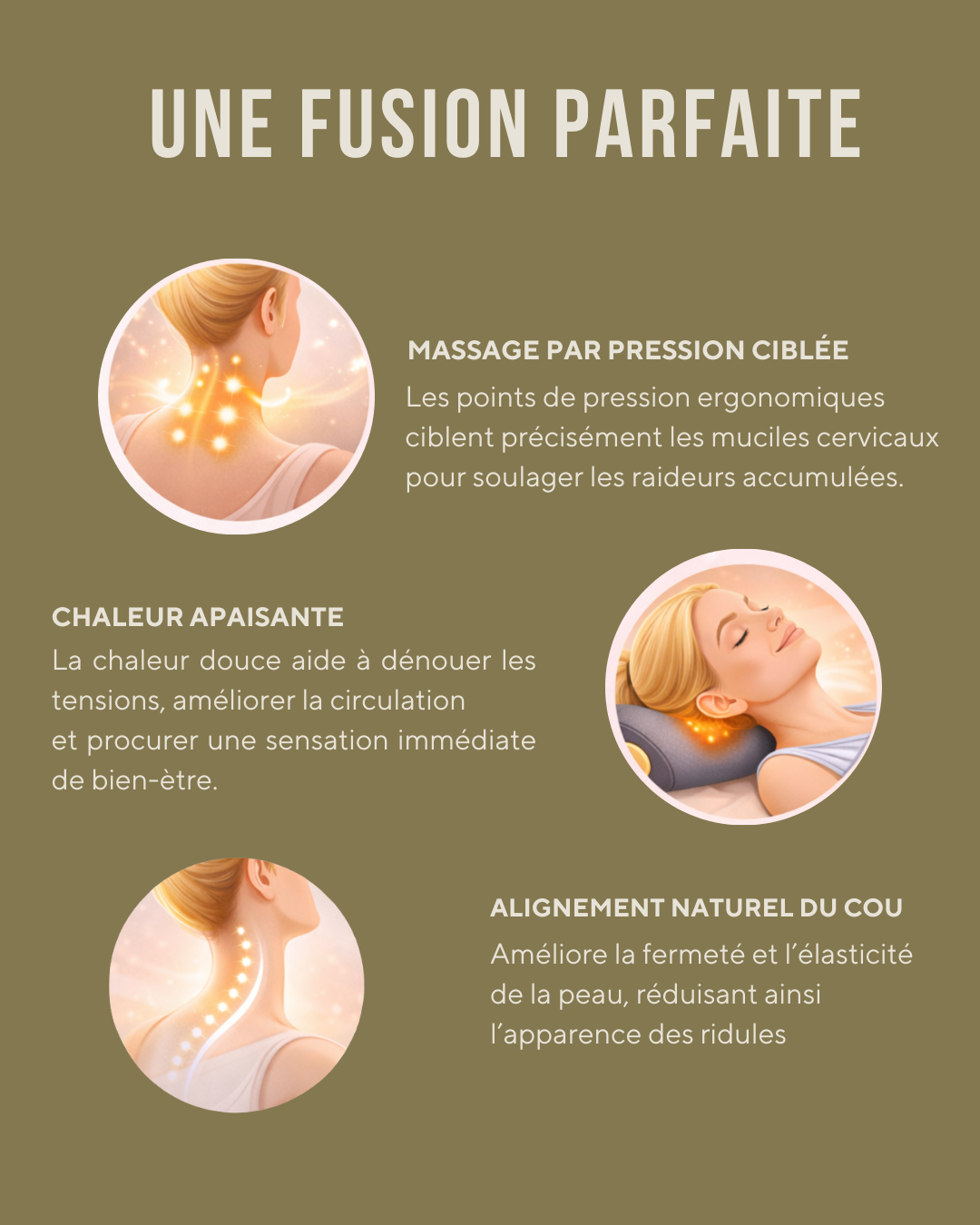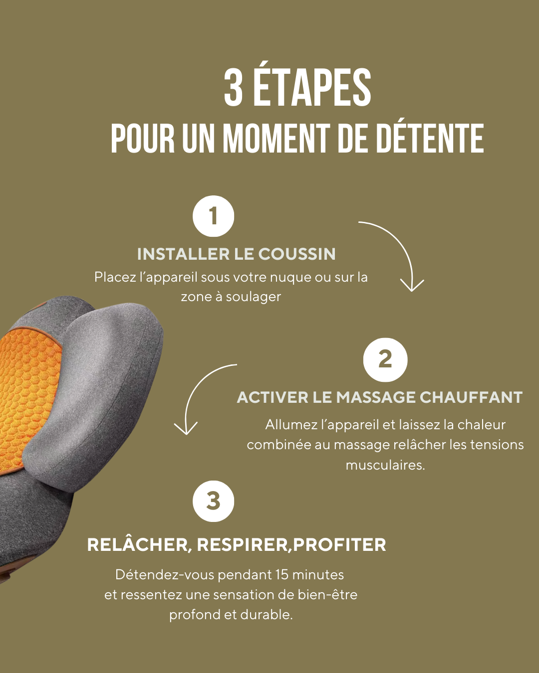 Il combine un massage cervical ciblé et une chaleur douce apaisante . Cette double action aide à relâcher les muscles en profondeur, à soulager les zones crispées et à favoriser une détente progressive de la nuque.