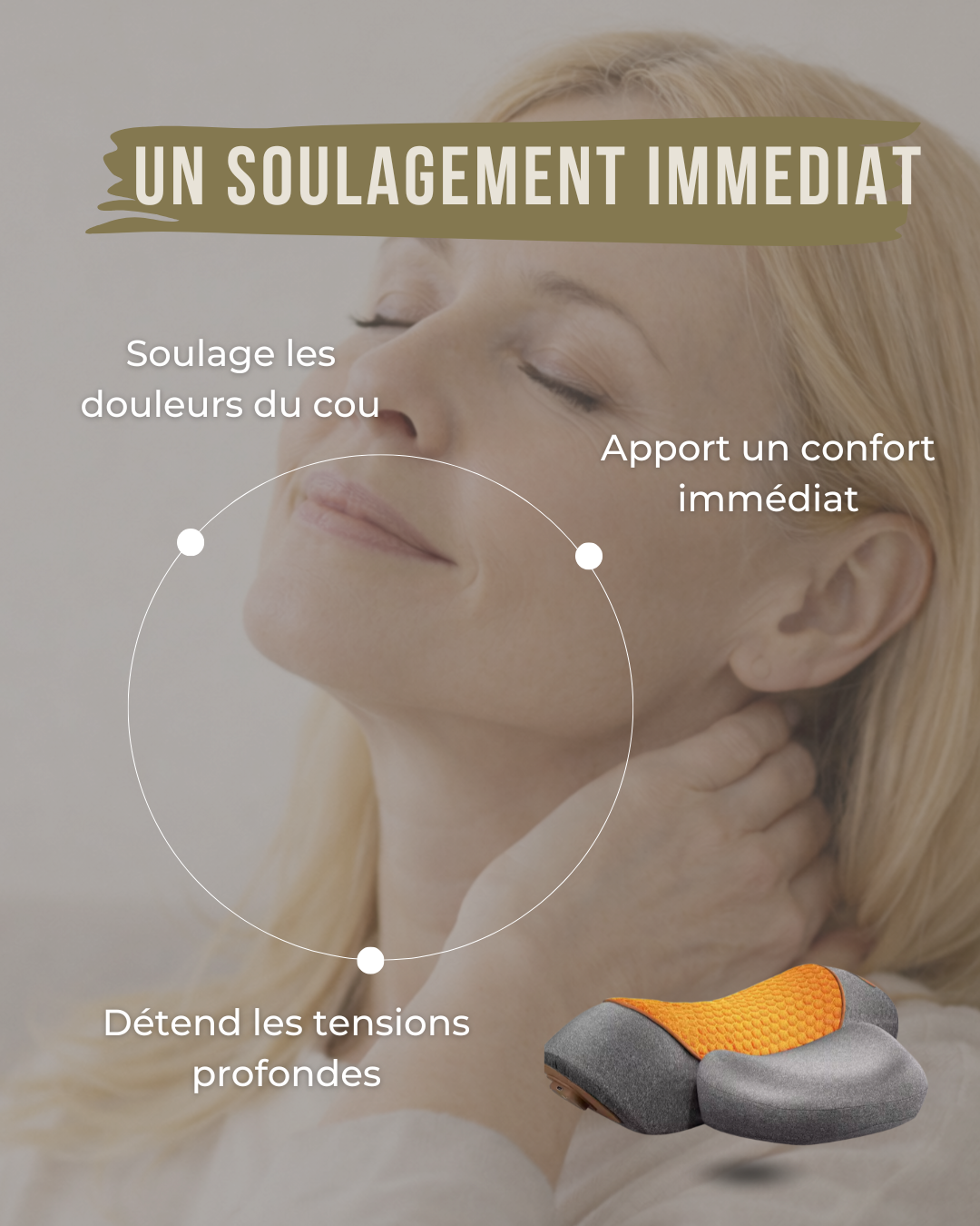 Grâce à une douce combinée à un massage cervical ciblé, cet appareil étend les muscles trop sollicités et soutient naturellement la courbe du cou, sans effort ni médicaments.